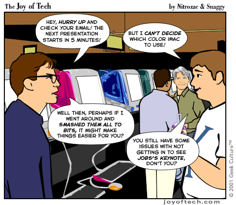 Welcome to the Joy of Tech... by Nitrozac and Snaggy. It's a little bit simpler in style than our other comic After Y2K, and a little more topical. We hope you enJoy! |