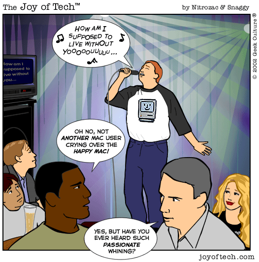 If you're using a Mac and a newer version of Explorer, here's a neat trick courtesy of MacMerc. Drag the above little image to the top tool bar of your browser, it should "stick" afterwards. Now you have a graphical link to the Joy of Tech, one that will update everytime a new comic is uploaded. (You may have to refresh the image manually if it's in your cache.) If you need to delete or move it it, just control button/click and hold, then select delete, or just Command/drag it to the trash.