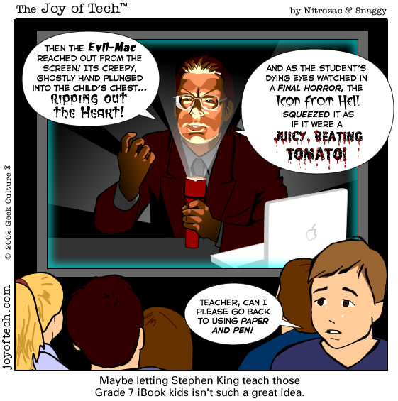 If you're using a Mac and a newer version of Explorer, here's a neat trick courtesy of MacMerc. Drag the above little image to the top tool bar of your browser, it should "stick" afterwards. Now you have a graphical link to the Joy of Tech, one that will update everytime a new comic is uploaded. (You may have to refresh the image manually if it's in your cache.) If you need to delete or move it it, just control button/click and hold, then select delete, or just Command/drag it to the trash.