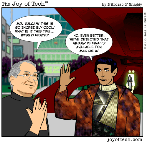 If you're using a Mac and a newer version of Explorer, here's a neat trick courtesy of MacMerc. Drag the above little image to the top tool bar of your browser, it should "stick" afterwards. Now you have a graphical link to the Joy of Tech, one that will update everytime a new comic is uploaded. (You may have to refresh the image manually if it's in your cache.) If you need to delete or move it it, just control button/click and hold, then select delete, or just Command/drag it to the trash.