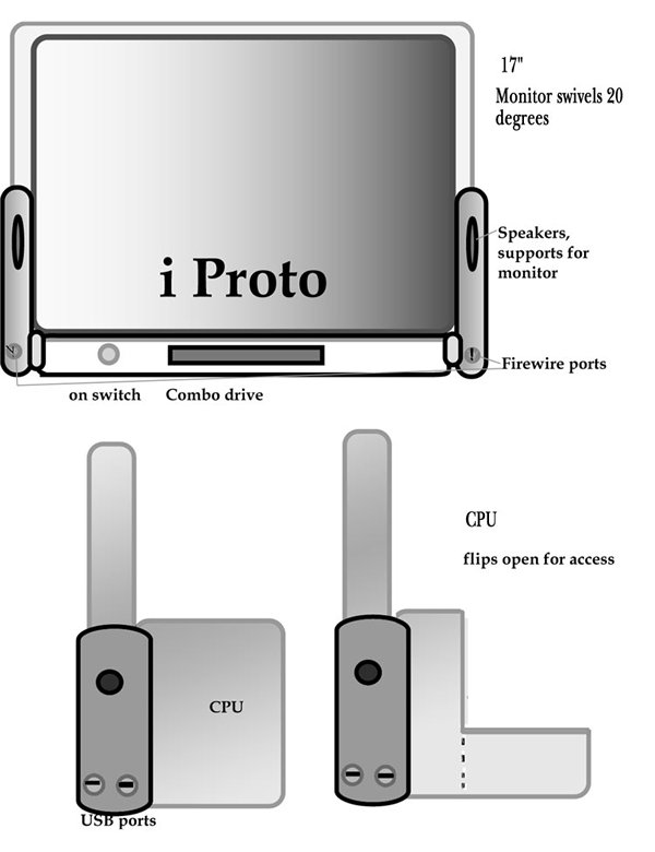 Here's my prototype of an LCD iMac. It would have a 17" swiveling display attached to a cube-like CPU. The side supports contain the speakers and front-mounted firewire ports. The back of the CPU will swing down for access to the "innards". It will come in shades of smoke and ice. My dream machine also has an uninterruptible power source with battery support integrated into the package. I can dream!