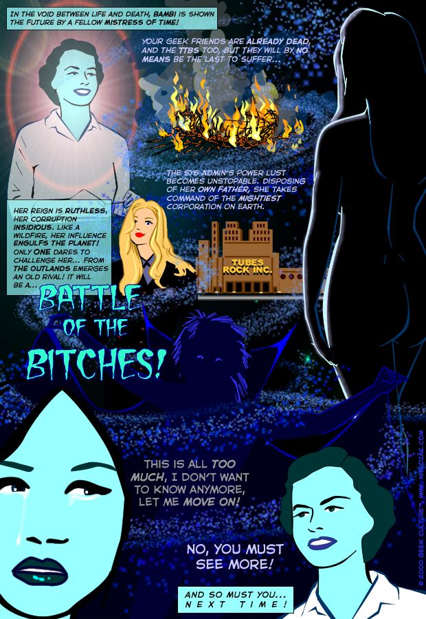 Bambi in the Void! On the edge of death, Bambi receives a visit from one of the First Four! Revealing herself to be a Mistress of Time, she proceeds to show Bambi the future.... a future without Bambi! A mind boggling, time twisting, comic-shaking episode, featuring the lovely and diabolical Sys Admin, and return of Lord Stewart (and boy, does she looks pissed!). A rich print of the comic, with Martha's silhouette ominously emerging from the deep dark blues. 11x17 inch poster sized print... only 9.95! |