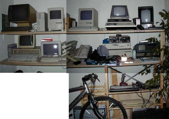| Your Guide to The Museum from left to right, top to bottom, years are introduction years: - HP 2624A Terminal, ca. 1980 (Linux actually has a Termcap entry for it) - Apple Macintosh Quadra 700, 1991 - Apple Macintosh Color Classic, 1993 - Apple Macintosh Plus, 1986 - Commodore PET 2001 Series, 1977 - MB Vectrex, 1982 - DEC Rainbow - maybe the coolest thing of all these, has a Z80 for CP/M and an 8088 for a modified MS-DOS, and has a third mode in which it behaves like a VT52 Terminal. 64K RAM, 2*5.25" Floppy, and a 5.25" full height 5MB Winchester Drive, 1983 - Atari 520ST w/ SM124 Screen, 1986 - various keyboards from DEC, IBM, Sun, ... - 2* Apple whatever-its-official-name-may-be Floppy Drive for Apple ][ Computers, year unknown - IBM PS/2 Model 30, 1987 - Apple Macintosh II, 1987 - Commodore SX64 "Executive Computer", ca. 1984 - Commodore 16, 1984 - Commodore 64 II, 1986 - (behind the bike) DEC AlphaStation 255, 1996 - (in the black bag on the bottom of the Pic) Sun SparcStation Voyager, 1995 - (behind that black bag, not visible at all) Axil 235 (SparcStation 10 Clone), ca. 1995 Wow, I never catalogued all the shit... missing ('cause they're in the basement) are the Amiga 2000, the Amiga 500 and the C64 first Generation. Except for the Quadra and the Mac II (no disk, no RAM), all machines run perfectly. The DEC and the Sparcs run Linux, more or less well. Well, the "new" hardware ain't that exciting, but I'll make it complete: Sony 420GS screen, SGI (Sony OEM) GDM 20E21 screen, SGI Indigo2 R10K Solid Impact, Telekom Europa 20 Phone, IBM WorkPad C3, Apple Color StyleWriter 1500, Sony Vaio PCG505TX (running Linux), various CD/DAT/Harddisk Drives, Agfa SnapScan 600, Apple Power Mac G4/450, Generic AMD Athlon/650 (also running Linux). Editor's Note: I believe the appropriate comment would be .... Whoa! Thanks Telnet Junkie! |
