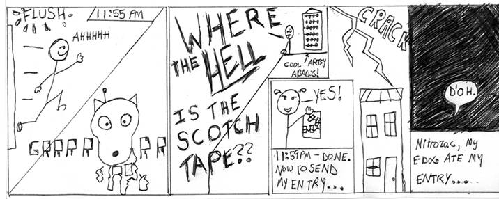 I just started to read the comic recently and thought I'd give a whirl for the contest in Nitro's own medium...I have gained an enormous amount of respect for anyone who picks up the pen to do this....It's hard! so the items: 1. Me : astro grad student->means I'm a geek -> there's the geek in AY2K, drawn by Nitrozac 2. date and time: the year 2000, the beginning year of AY2K, also the final entry date of the contest! (whooo!) 3. this is a comic: just like AY2K 4. self-references: just like Nitrozac but she does it better! 5. my girlfriend wears sexy boots: just like Nitrozac 6. my girlfriend is a total TTB: she's a hottie _and_ a biology grad student, ergo a techno talking babe with genetic powers :), just like the TTBs in AY2K 7. Photoshop: one of the many tools Nitrozac uses to publish her comic 8. Pizza and coffee: main staples of the Geek, character in AY2K 9. AIBO: robotic dog similar to the one created by the Geek. 10. a bathroom: the room Bill Gates is stuck in in AY2K 11. abacus: one way to get around the y2k bug in Ay2k--I actually knew someone who collects vacuum tubes, but that's random... 12: power outages: just like those experienced due to the y2k bug 13. D'oh: famous expression by Homer Simpson, a cartoon and comics character, just like those in AY2K. 14. My Martha Stewart curtains: I own Martha Stewart curtains. Martha is a character in AY2K. 15. tetrad analysis: a biological technique used to study yeast genes. yeast is a main component of bread doughs. bread dough is essential for pizza, which is already linked to AY2K 16. red glow in Aibo's eyes: reference to the Terminator, of which Arnold Schwarzzenager(sp?) is a star. Arnie is buff just like Linus Torvalds' shower scene in AY2K. |