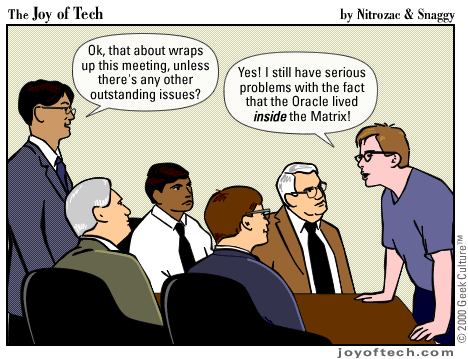 Welcome to the Joy of Tech... illustrated by Nitrozac and written by Nitrozac and Snaggy. It's a little bit simpler in style than our other comic After Y2K, and will be more topical. We hope you'll enjoy it! |