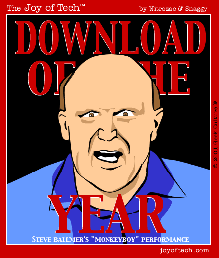 | The Joy of Tech's choice for Download of the Year is often controversial, especially in this, its first year. But one must keep in mind that the criterion is the person or thing that has had the greatest impact on the web for good or ill. After much debate and consideration, we have chosen Steve Ballmer's MonkeyBoy video performance as Download of the Year 2001. "Rarely has so improbable a CEO shaken the web stage, and with such abandonment. Ballmer's performance, both shocking and exhilarating, sets a new standard for keynotes. |