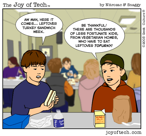 If you're using a Mac and a newer version of Explorer, here's a neat trick courtesy of MacMerc. Drag the above little image to the top tool bar of your browser, it should "stick" afterwards. Now you have a graphical link to the Joy of Tech, one that will update everytime a new comic is uploaded. (You may have to refresh the image manually if it's in your cache.) If you need to delete or move it it, just control button/click and hold, then select delete, or just Command/drag it to the trash.