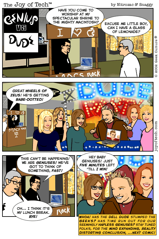 | Important note: Unfortunately, Apple Legal is again demanding we remove our Mac Genius t-shirts and Mac Genius Polo merchandise. We are currently in consultations (again) with our own lawyers, but in the meantime, we continue to offer our fans our products. Please stand by, and thank you for your understanding, patience, and patronage. -Nitrozac and Snaggy |