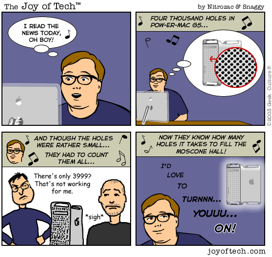 If you're using a Mac and a newer version of Explorer, here's a neat trick courtesy of MacMerc. Drag the above little image to the top tool bar of your browser, it should "stick" afterwards. Now you have a graphical link to the Joy of Tech, one that will update everytime a new comic is uploaded. (You may have to refresh the image manually if it's in your cache.) If you need to delete or move it it, just control button/click and hold, then select delete, or just Command/drag it to the trash.