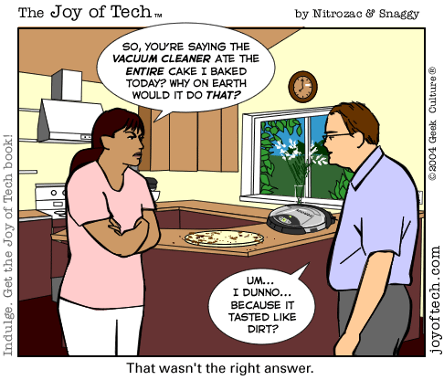"I don't know why the vacuum cleaner ate the whole cake, it knocked me out first."