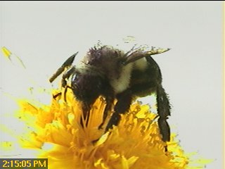 A BumbleBee (who was stuck in a lamp fixture for a few days) enjoys some refreshing Dandelion nectar!